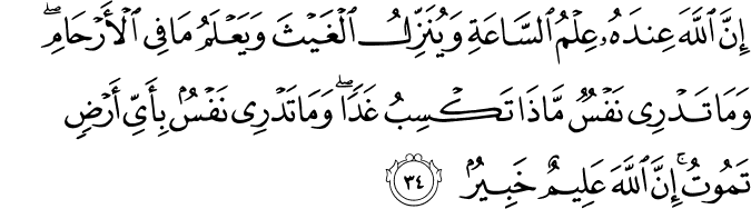 « En vérité, Allah ! Avec Lui (seul) est la connaissance de l’Heure, Il fait tomber la pluie, Il sait ce qui est dans les entrailles, personne ne sait ce qu’il gagnera demain et personne ne sait dans quel pays il mourra. En effet, Allah est Omniscient et Omniscient. » [Surah Luqman – 31:34]