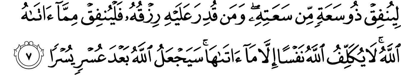 « Que l’homme riche dépense de sa richesse, et celui dont les ressources sont limitées – qu’il dépense de ce qu’Allah lui a donné. Allah ne charge une âme que selon ce qu’Il lui a donné. Allah apportera, après les difficultés, la facilité. » [Surah At-Talaq – 65:7]